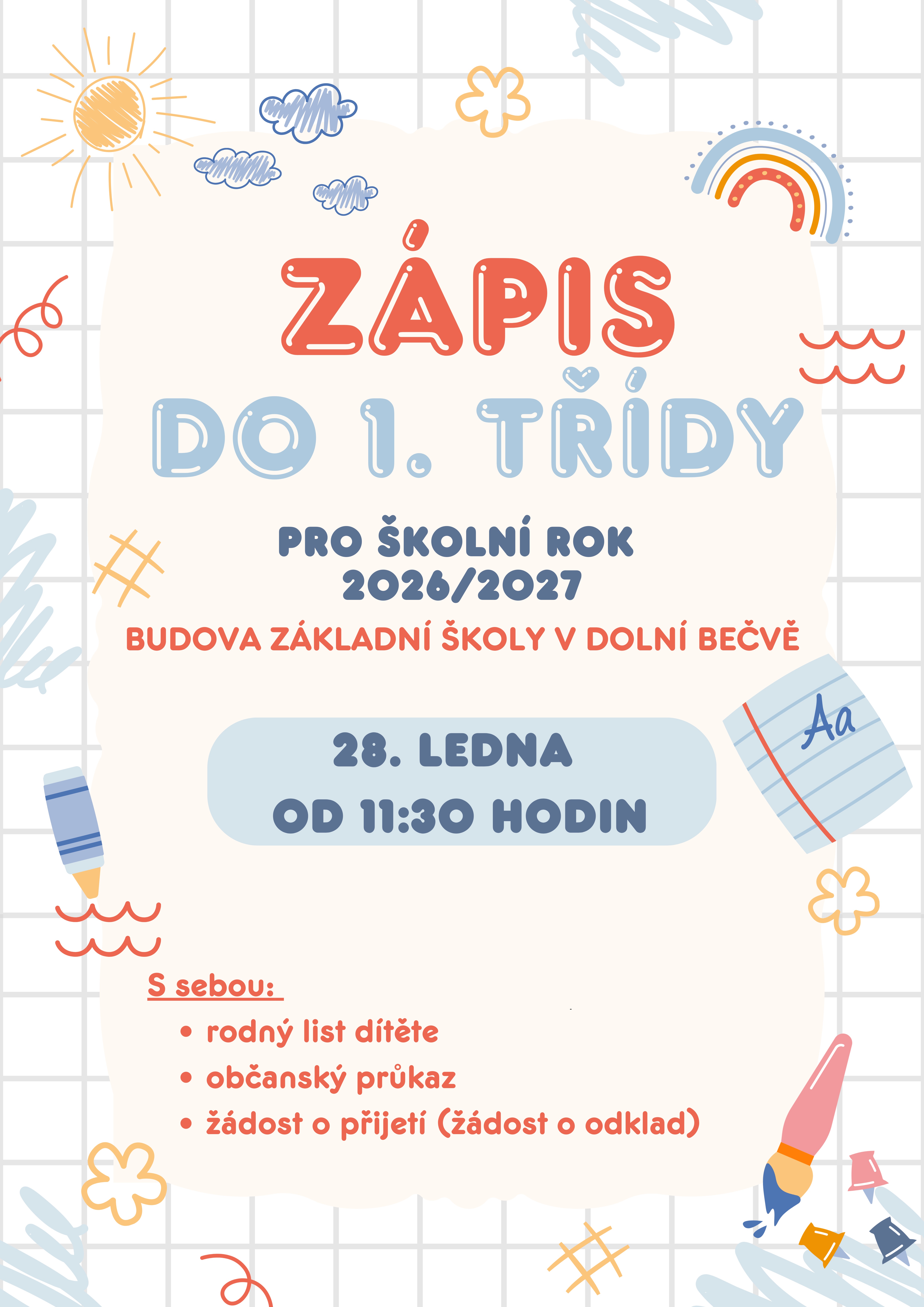 Zápis do 1. třídy se uskuteční ve středu 28.1.2026 od 11:30 hodin v budově základní školy.